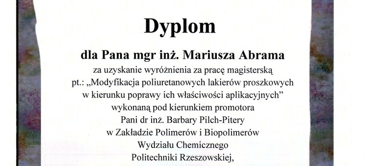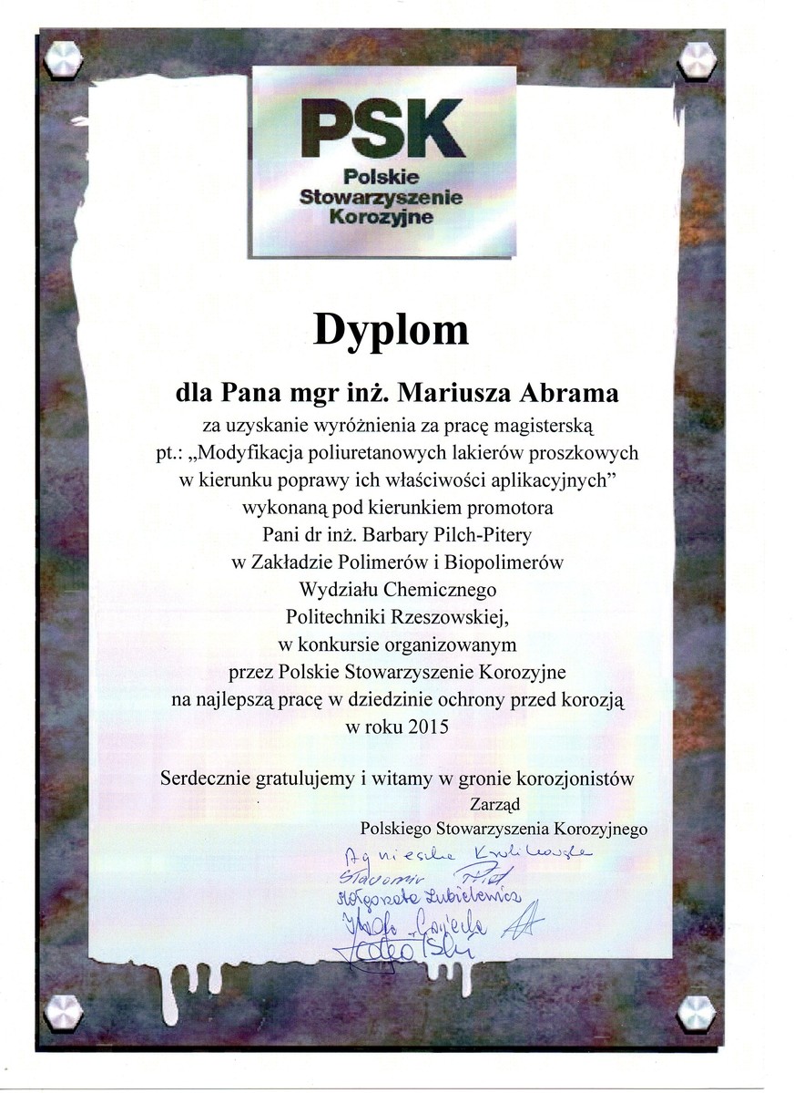Miło nam poinformować, że praca dyplomowa mgr. inż. Mariusza Abrama, absolwenta kierunku Technologia Chemiczna, pt. „Modyfikacja poliuretanowych lakierów proszkowych w kierunku poprawy ich właściwości aplikacyjnych” została wyróżniona w konkursie na najlepszą pracę magisterską ogłoszonym przez Polskie Stowarzyszenie Korozyjne. Nagroda jest szczególnie cenna gdyż została przyznana przez Kapitułę, w której w skład wchodzili przedstawiciele nauki, przemysłu i Zarządu PSK. Kapituła oceniała m. in. oryginalność opracowania, przydatność w praktyce i możliwość wdrożenia.