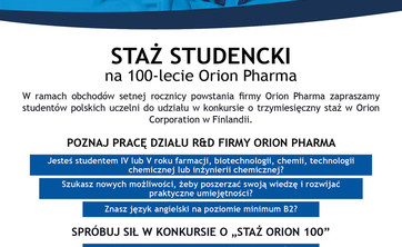W ramach obchodów setnej rocznicy działalności firmy Orion Pharma oddział firmy w Polsce zorganizował konkurs na staż dla studentów polskich uczelni.
