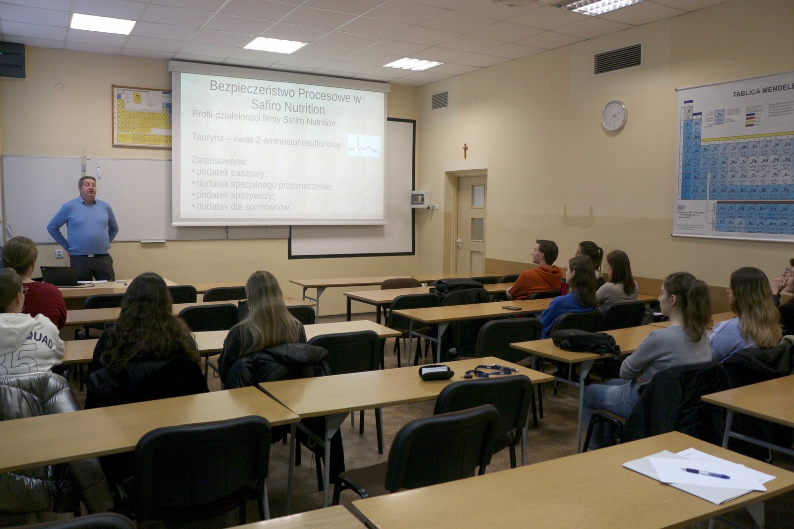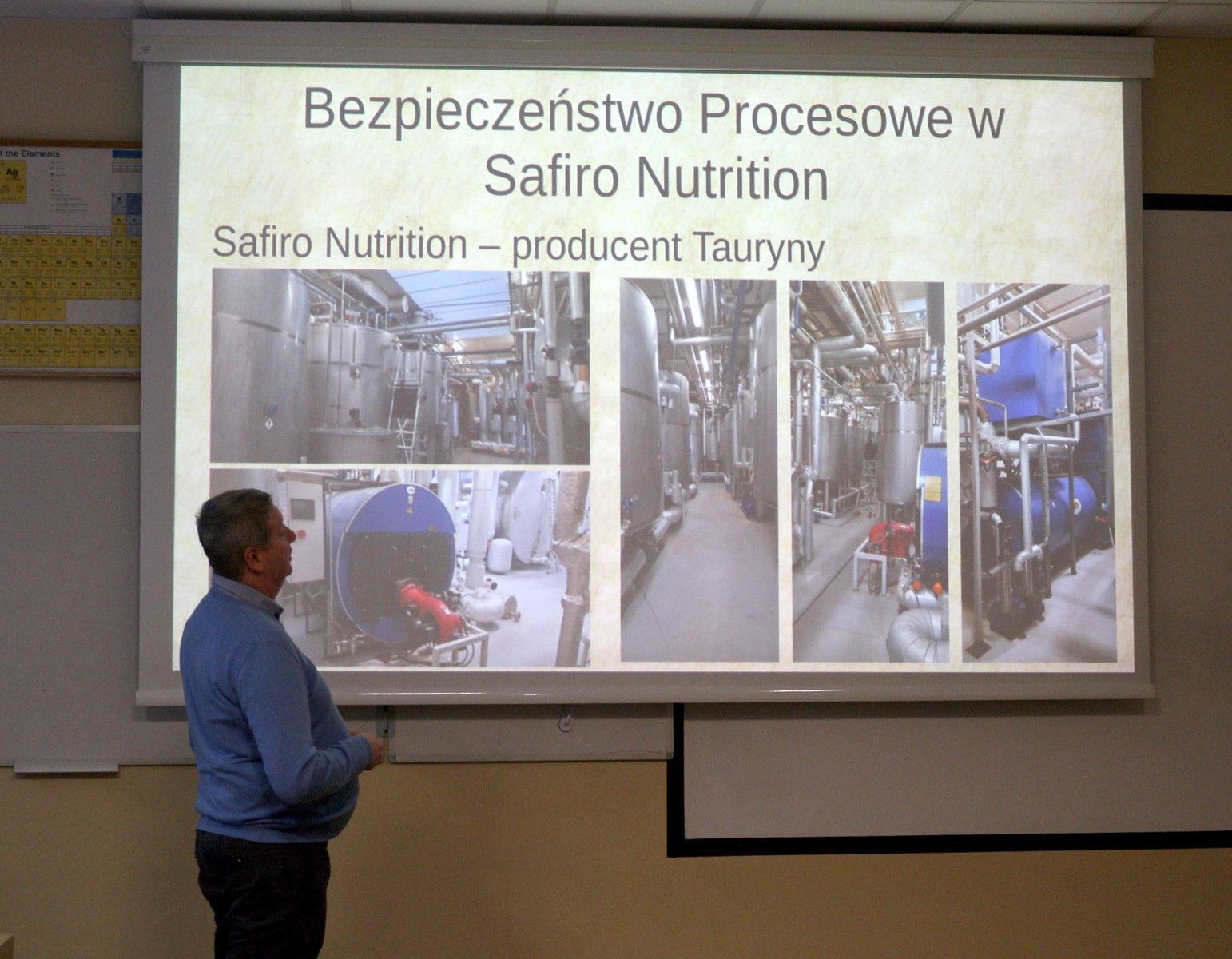 W ramach wykładu studenci mieli możliwość poznania nowoczesnych rozwiązań z zakresu bezpieczeństwa stosowanych w zakładzie produkcyjnym firmy Safiro Nutrition - jedynego producenta tauryny w Europie. Dr Sitarz omówił również wiele rozwiązań technicznych zastosowanych w procesie produkcyjnym. Studenci mieli okazję do zadawania pytań odnośnie interesujących ich szczegółów aparatury i innowacyjnej technologii produkcji tauryny.