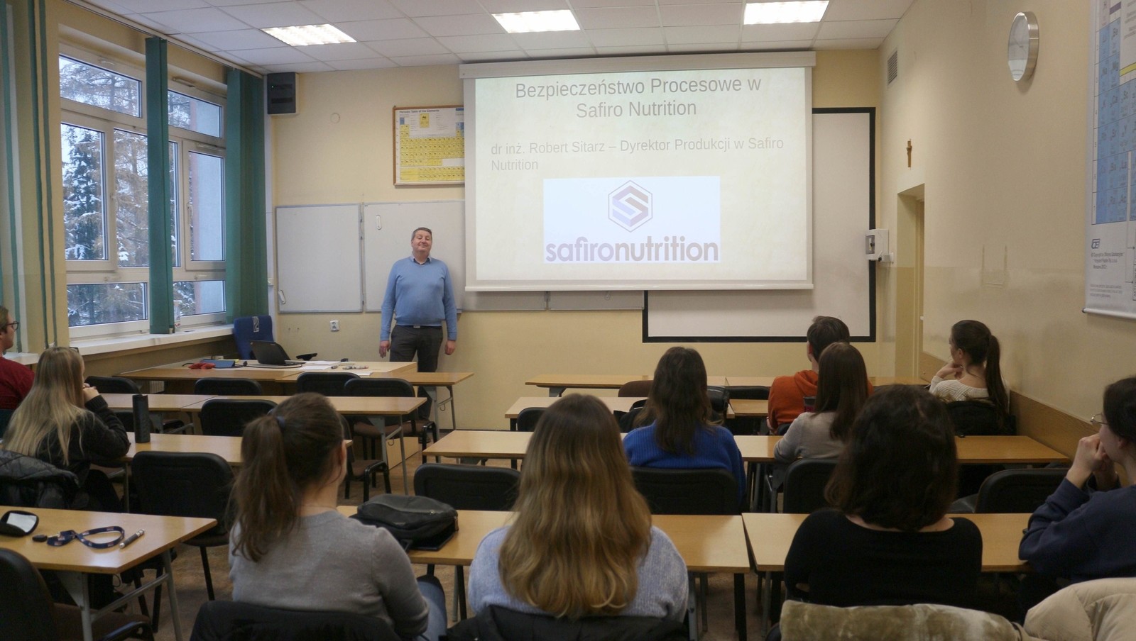 Studenci IV roku studiów kierunku Inżynieria farmaceutyczna uczestniczyli w wykładzie pt. „Bezpieczeństwo procesowe w Safiro Nutrition”. Wykład został wygłoszony przez dr inż. Roberta Sitarza, dyrektora produkcji w firmie Safiro Nutrition, absolwenta naszego Wydziału.