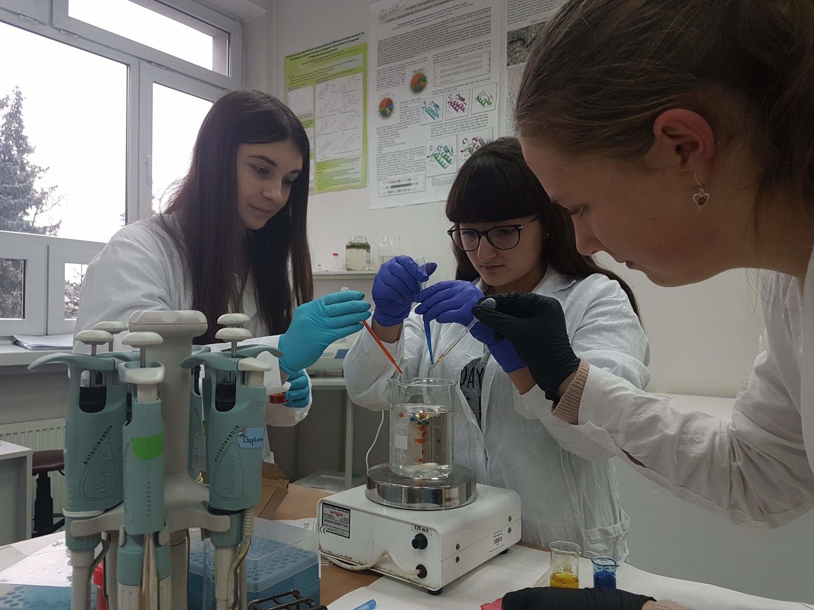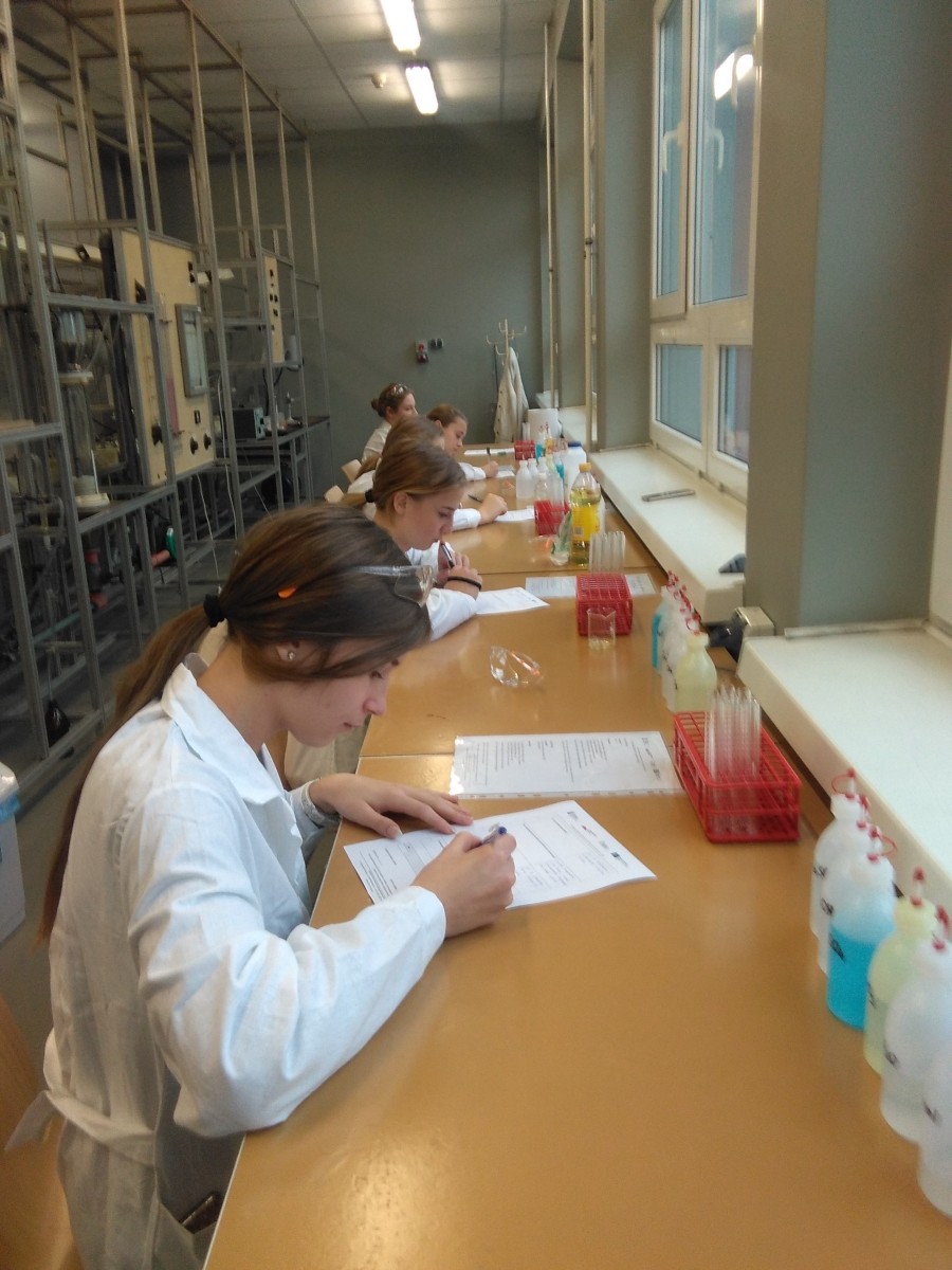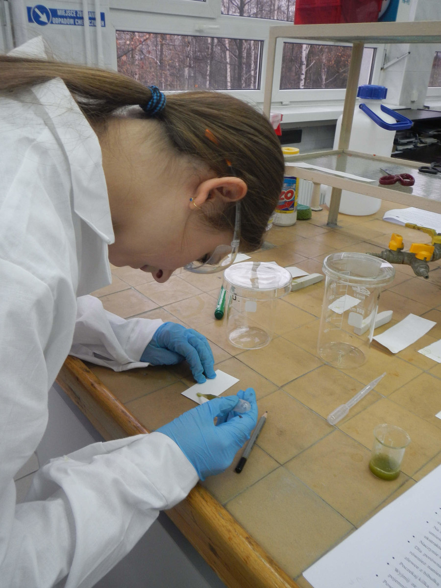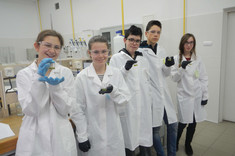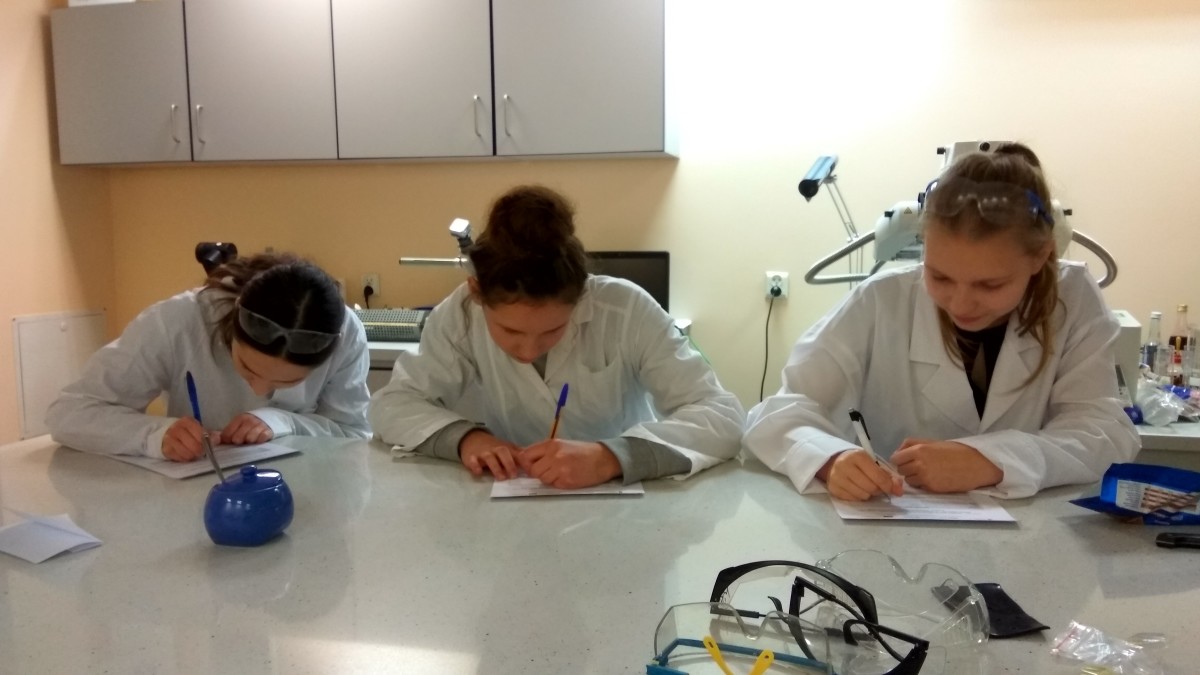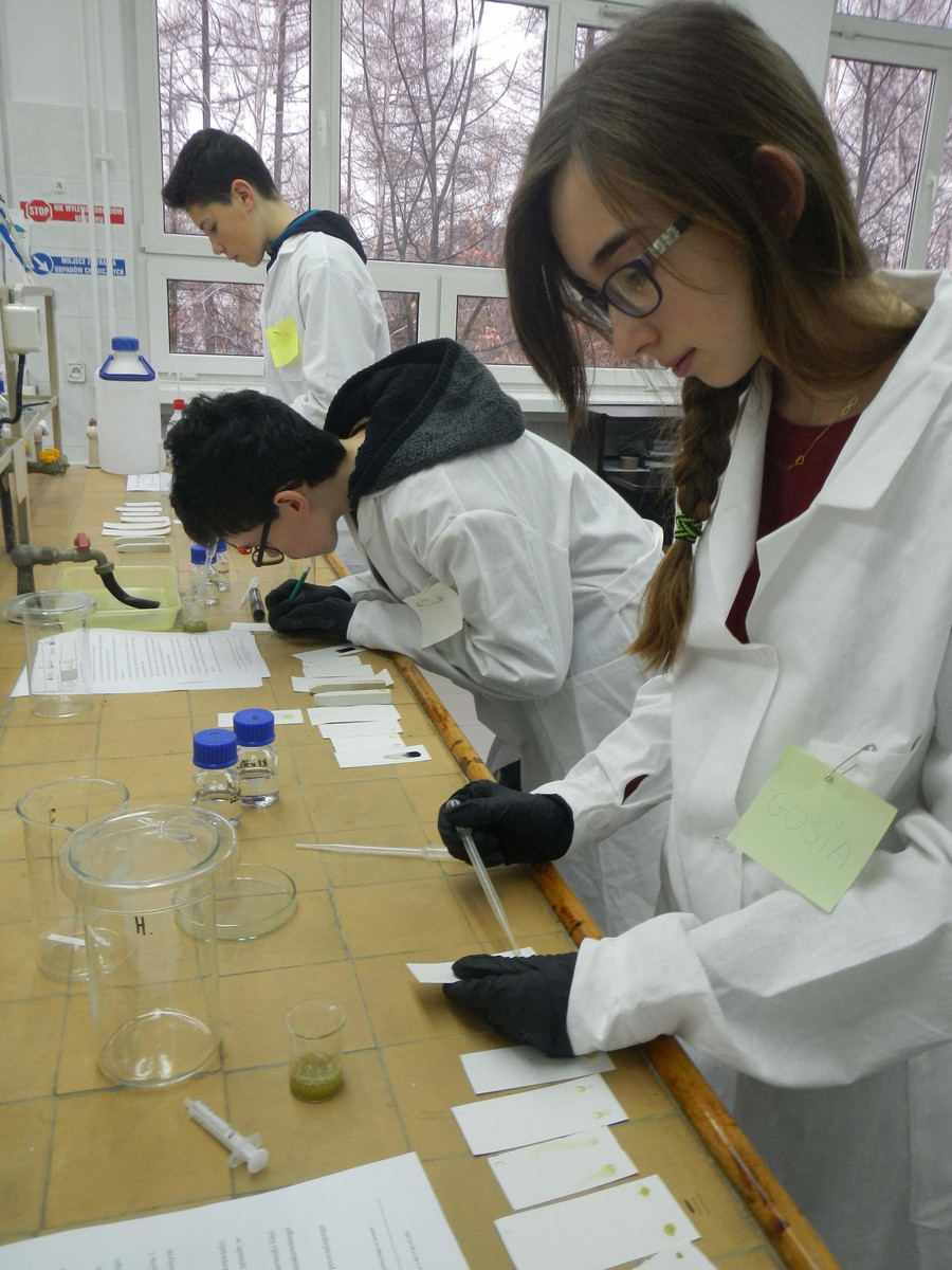 Podczas zajęć laboratoryjnych uczniowie, jak prawdziwi studenci zaopatrzeni w środki ochrony osobistej (fartuchy, okulary i rękawice), z entuzjazmem przeprowadzali ciekawe eksperymenty chemiczne pod fachowym okiem prowadzących …