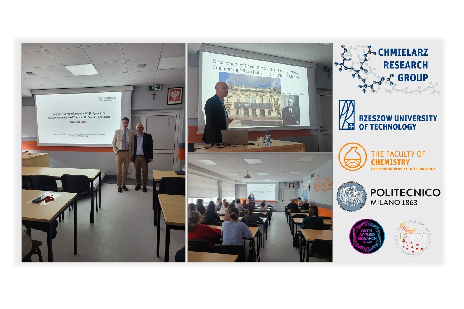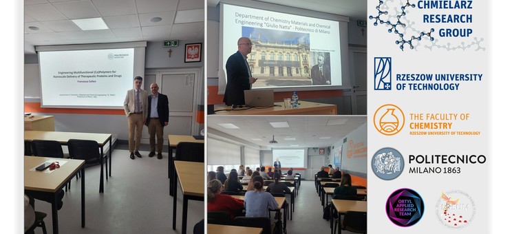 W dniach 8-10 stycznia 2024 r. w Katedrze Chemii Fizycznej na Wydziale Chemicznym Politechniki Rzeszowskiej gościliśmy współpracownika naukowego z Politechniki Mediolańskiej - prof. Francesco Cellesiego, uznanego eksperta specjalizującego się w zastosowaniu technik ATRP do modyfikacji białek w celu syntezy biokoniugatów białko-polimer do stosowanych w farmakologii. W ramach swojego pobytu Profesor uczestniczył w uroczystościach nadania tytułu doctora honoris causa Politechniki Rzeszowskiej prof. Krzysztofowi Matyjaszewskiemu. Ostatniego dnia swojego pobytu prof. Cellesi wygłosił do członków Chmielarz Research Group oraz Studenckiego i Doktoranckiego Koła Naukowego Inżynierii Chemicznej i Farmaceutycznej IPSUM, a także społeczności studentów i pracowników Wydziału Chemicznego interesujący wykład o tematyce związanej z modyfikacją białek z wykorzystaniem polimerów o różnorodnej topologii umożliwiającej związanie leków z białkami.