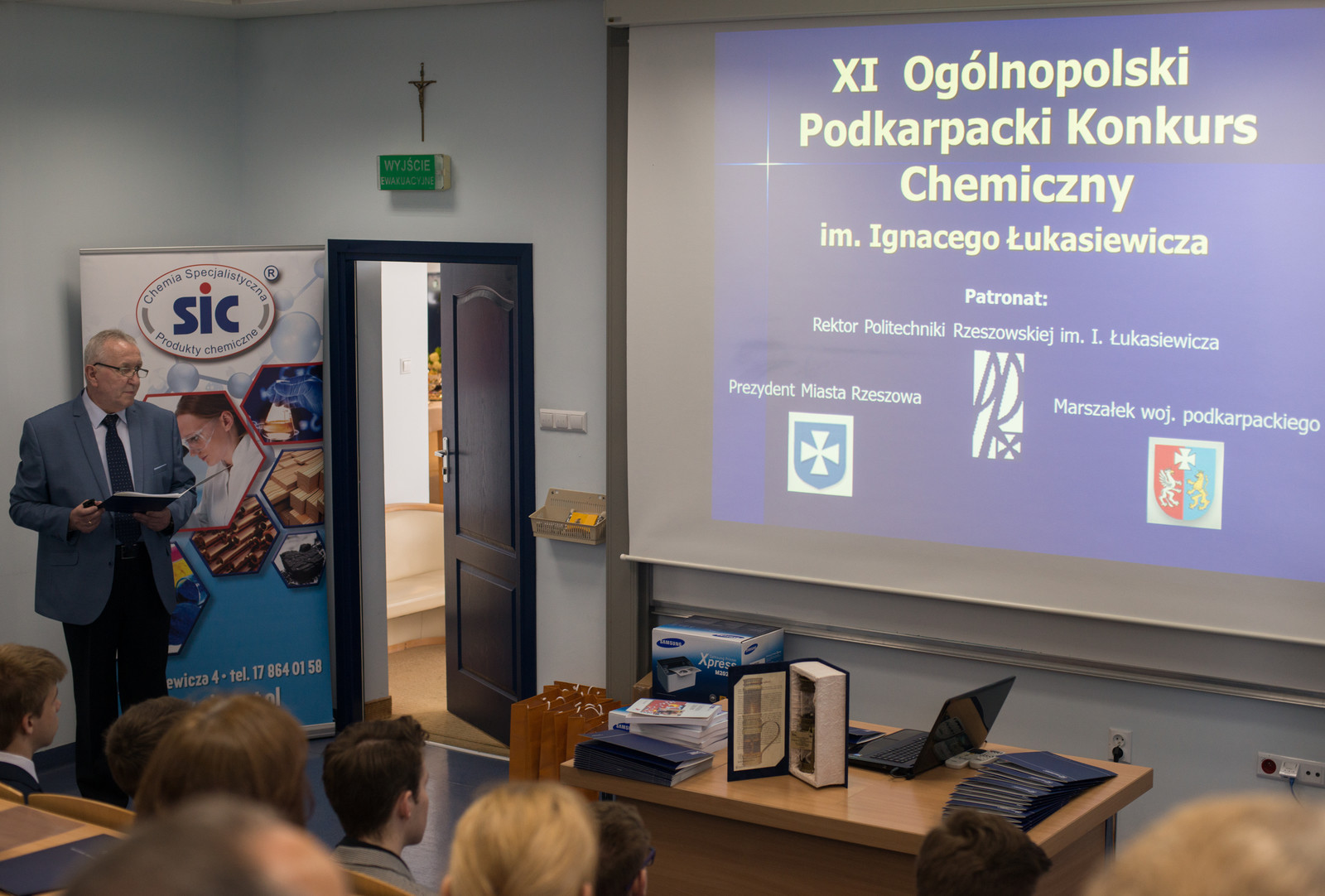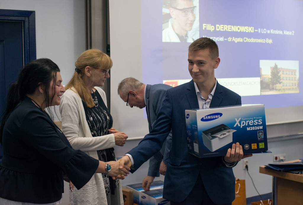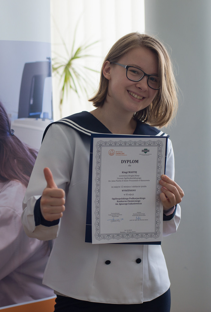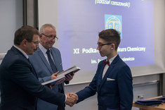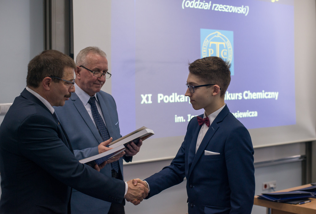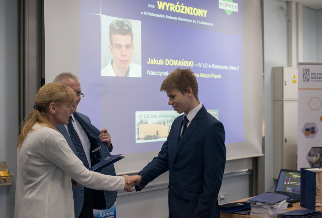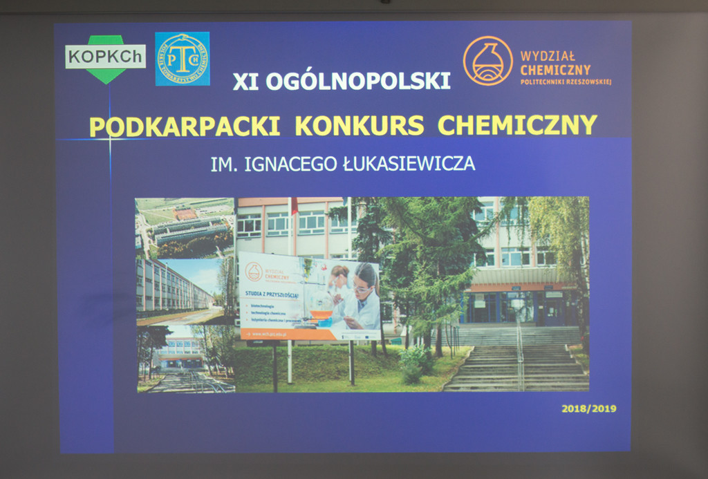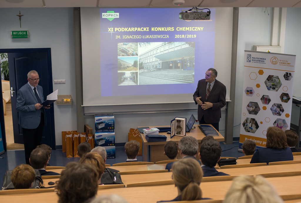 W dniu 18 maja 2019 roku w Klubie Pracownika Politechniki Rzeszowskiej odbyła się uroczystość zakończenia XI edycji Podkarpackiego Konkursu Chemicznego im. Ignacego Łukasiewicza, konkursu, nad którym honorowy patronat sprawują: JM Rektor PRz, marszałek woj. podkarpackiego oraz prezydent miasta Rzeszowa. W spotkaniu wzięli udział: pełnomocnik Prezydenta Rzeszowa ds. oświaty, opieki społecznej i osób niepełnosprawnych – mgr inż. Henryk Wolicki, zespół Dziekański Wydziału Chemicznego Politechniki Rzeszowskiej w osobach: Dziekana Wydziału – prof. dr hab. inż. Doroty Antos, Prodziekana Wydziału ds. Ogólnych – dr inż. Dorota Głowacz-Czerwonka, Prodziekan Wydziału ds. Kształcenia – dr inż. Joanna Wojturska, wizytator – koordynator ds. wdrażania podstaw programowych Kuratorium Oświaty – mgr Iwona Bereś, zastępcy przewodniczącego Rzeszowskiego Oddziału Polskiego Towarzystwa Chemicznego – mgr inż. Dymitr Malec. W uroczystym zakończeniu wzięli również udział uczniowie, nauczyciele, rodziny zawodników, przedstawiciele sponsorów w osobie dyrektora zarządu firmy SIC z Rzeszowa – mgr Mariusza Rzucidło oraz członkowie Komitetu Organizacyjnego Podkarpackiego Konkursu Chemicznego.