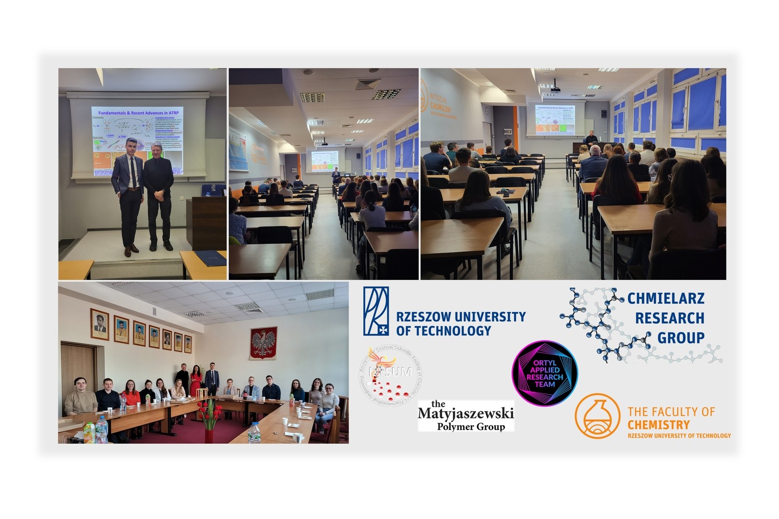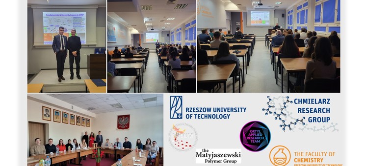 W ramach swojej wizyty Profesor Matyjaszewski zwiedził laboratoria grupy badawczej Chmielarz Research Group (CRG), a następnie spotkał się z członkami grupy badawczej oraz przedstawicielami Studenckiego i Doktoranckiego Koła Naukowego Inżynierii Chemicznej i Farmaceutycznej IPSUM, a także pracownikami Wydziału Chemicznego. W godzinach popołudniowych nasz honorowy gość - prof. Matyjaszewski wygłosił wykład pod tytułem: "Fundamentals and recent advances in ATRP", wprowadzając społeczność studentów i pracowników Wydziału Chemicznego w tematykę polimeryzacji rodnikowej z przeniesieniem atomu.