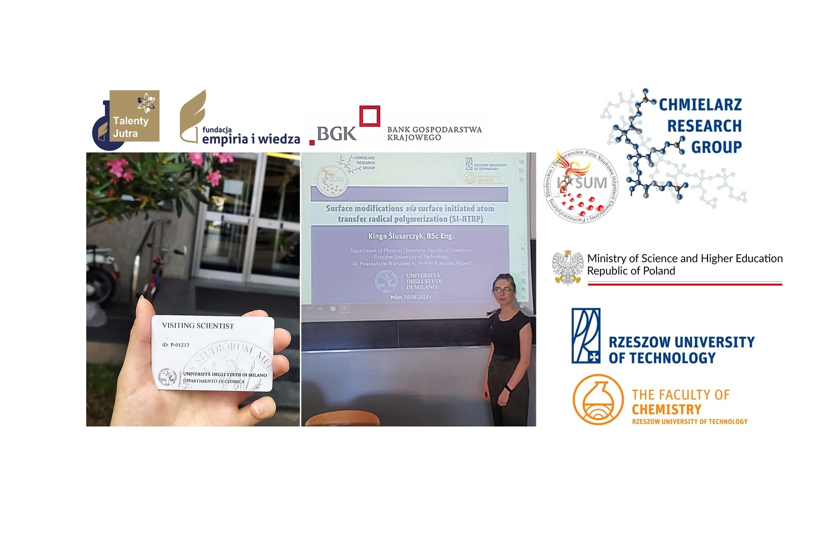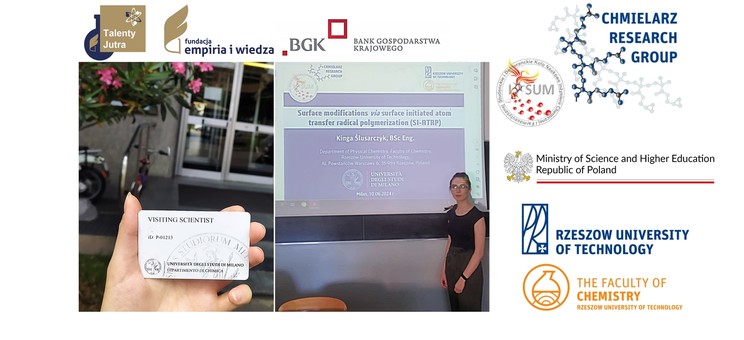 W dniach 1-15 czerwca 2024 roku inż. Kinga Ślusarczyk – studentka studiów magisterskich na kierunku Technologia chemiczna Wydziału Chemicznego Politechniki Rzeszowskiej oraz członkini Studenckiego i Doktoranckiego Koła Inżynierii Chemicznej i Farmaceutycznej „IPSUM”, realizująca swoją pracę naukową w grupie badawczej prof. dr hab. inż. Pawła Chmielarza (Chmielarz Research Group) uczestniczyła w stażu naukowo-badawczym w grupie prof. Elisabetty Ranucci, specjalizującej się w syntezie poliamidoaminokwasów oraz ich wykorzystania w roli związków zmniejszających palność bawełny, na Wydziale Chemicznym Uniwersytetu w Mediolanie.