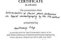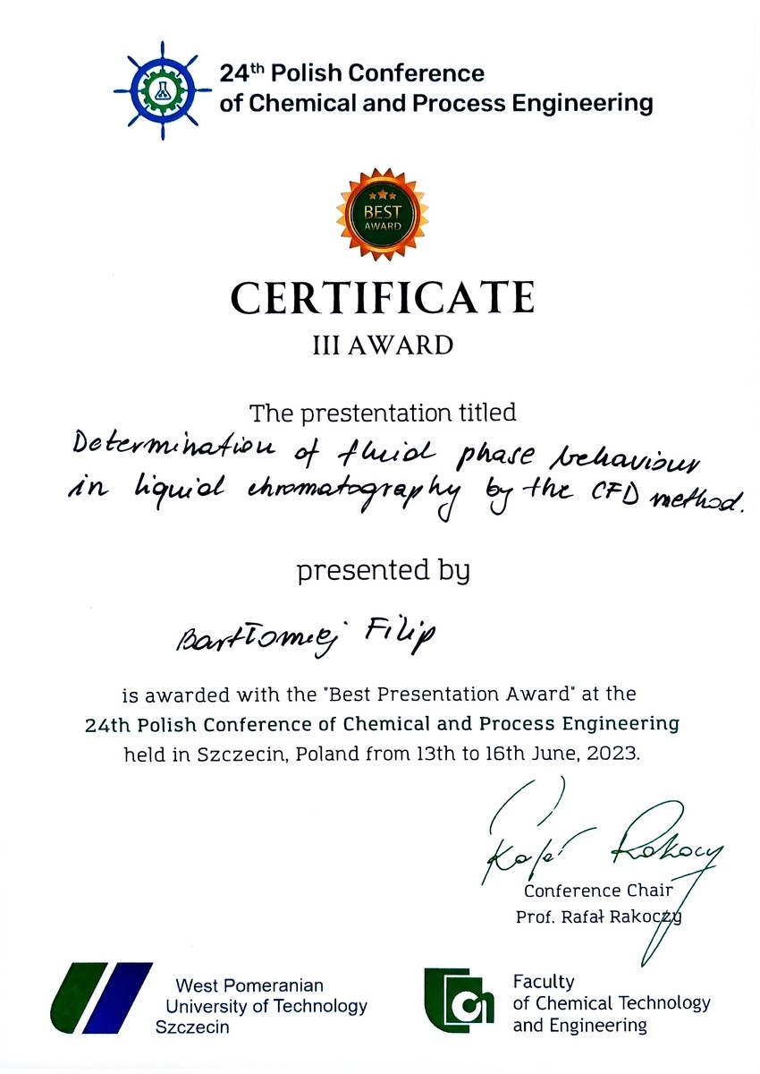 Mgr inż. Bartłomiej Filip - doktorant 4. roku w dyscyplinie Inżynieria chemiczna zdobył 3. miejsce w konkursie na najlepszą ustną prezentację wśród młodych naukowców, wygłoszoną podczas 24. Ogólnopolskiej Konferencji Inżynierii Chemicznej i Procesowej. Doktorant zaprezentował wyniki swoich badań w języku angielskim.