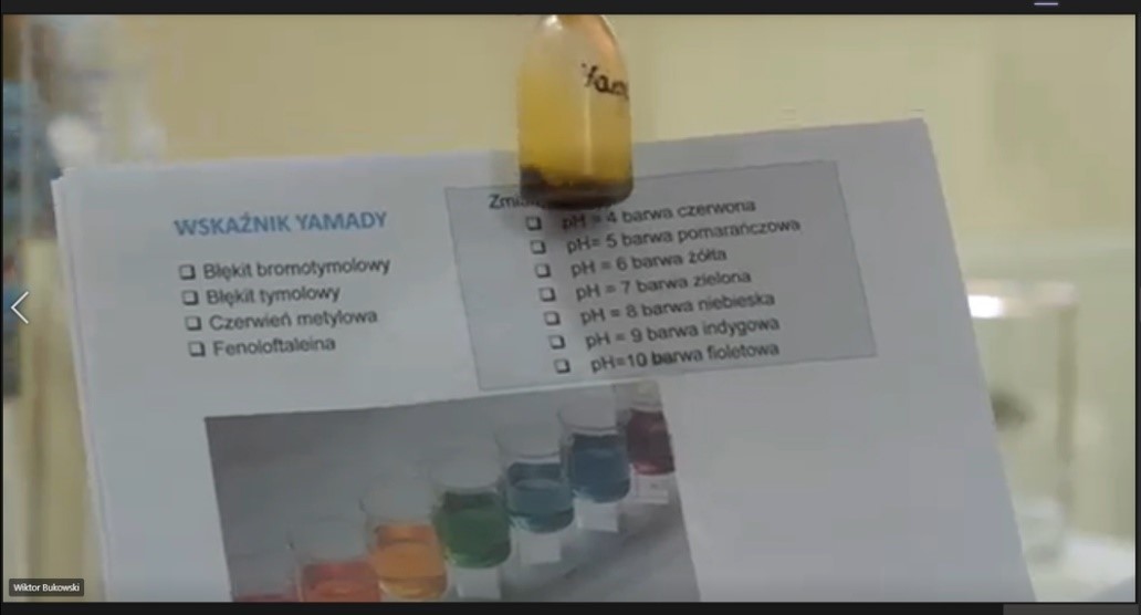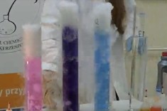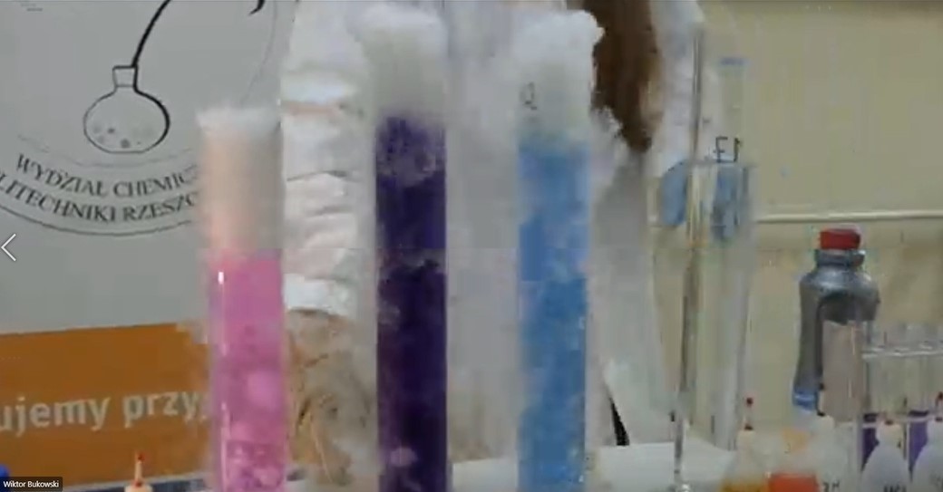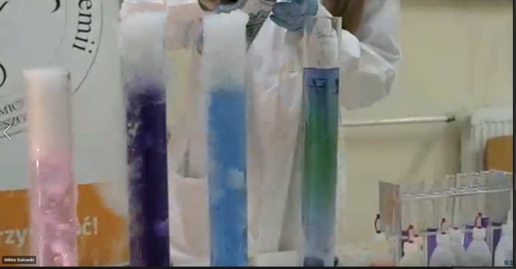 Zaprezentowano eksperymenty obejmujące: wskaźniki kwasowo-zasadowe (miareczkowanie, indykatory), hydrolizę soli, reakcje strącania (złoty deszcz) oraz wskaźniki i reakcje redox (chemiczny kameleon, wąż duch (zgodny z logo Koła)).