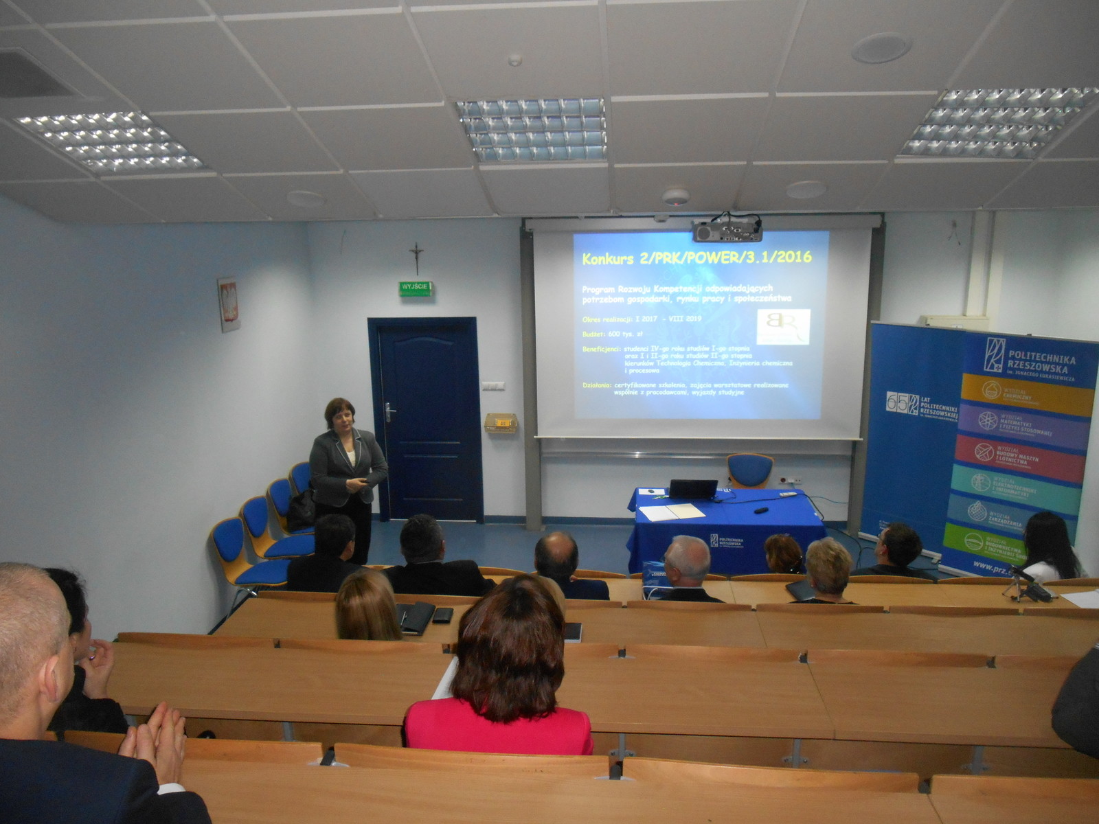 W części oficjalnej głos zabrali: Dziekan Wydziału Chemicznego, prof. dr hab. inż. Dorota Antos, która powitała przybyłych gości, Prodziekan ds. Kształcenia dr inż. Joanna Wojturska, która przedstawiła ofertę dydaktyczną wydziału i omówiła możliwości współpracy w dziedzinie kształcenia studentów oraz dr inż. Dorota Głowacz-Czerwonka, Prodziekan ds. Ogólnych, która omawiając potencjał naukowo-badawczy wydziału nakreśliła pola do wspólnego działania w dziedzinie badań i innowacji. W spotkaniu wzięli również udział: Prorektor ds. rozwoju i kontaktów z gospodarką, dr hab. inż. Mariusz Oleksy, prof. PRz, dr hab. inż. Mirosław Tyrka, prof. PRz, Prodziekan ds. Nauki, a także Kierownik Administracyjny WCh i członkowie wydziałowego zespołu ds. kontaktu z przemysłem.