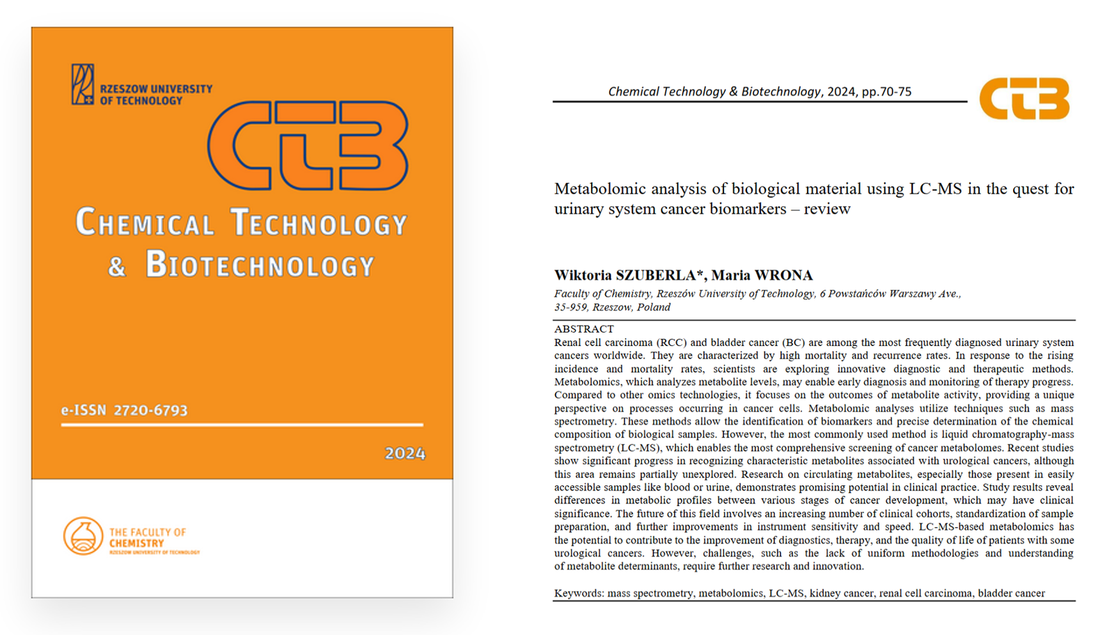 Praca o tytule „METABOLOMIC ANALYSIS OF BIOLOGICAL MATERIAL USING LC-MS IN THE QUEST FOR URINARY SYSTEM CANCER BIOMARKERS – REVIEW” dotyczy najnowszych osiągnięć w zakresie poszukiwania biomarkerów nowotworowych z wykorzystaniem nowoczesnych technik analizy instrumentalnej.