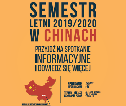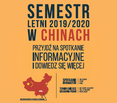 20 listopada 2019, o godz.11.30, w sali P-24 odbędzie się spotkanie informacyjne dla studentów, dotyczące wyjazdu na jednosemestralne studia w Huazhong University of Science and Technology w Wuhan (Chiny) w ramach umowy zawartej z Politechniką Rzeszowską w 2015 r.
