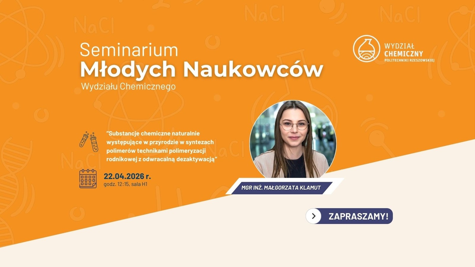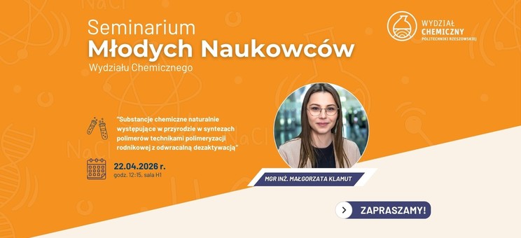 Serdecznie zapraszamy do sali H.1, gdzie 22.04.2026 r. o godzinie 12:15 odbędzie się seminarium mgr inż. Małgorzaty Klamut zatytułowane: „Substancje chemiczne naturalnie występujące w przyrodzie w syntezach polimerów technikami polimeryzacji rodnikowej z odwracalną dezaktywacją”.