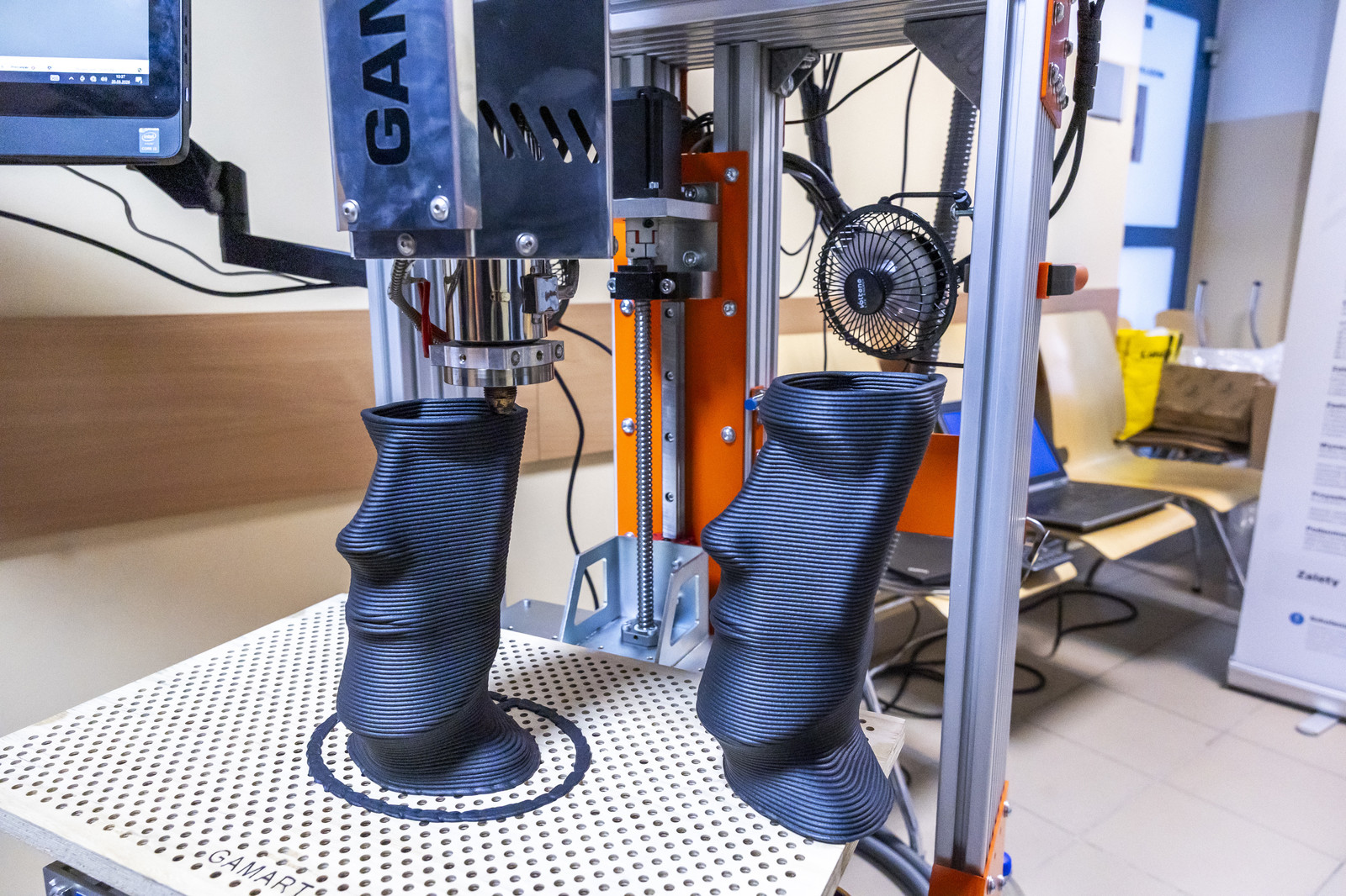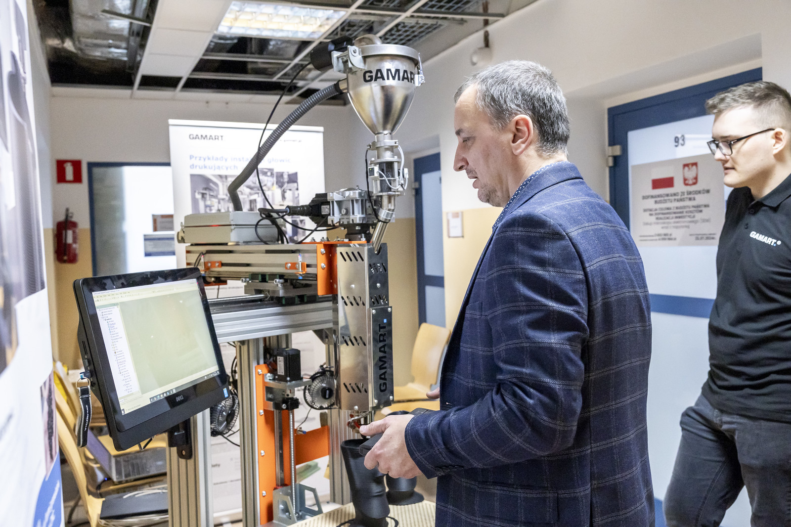 Na zakończenie zaprezentowano możliwości wykorzystania wielkogabarytowego i wysokotemperaturowego druku 3D w przemyśle, wskazując na jego potencjał w produkcji dużych elementów konstrukcyjnych oraz zastosowaniach specjalistycznych. Dodatkowo prelegent, Tomasz Pisz z firmy Gamart S.A., zaprezentował nowoczesną drukarkę 3D, która została niedawno opracowana. Urządzenie pracowało przez cały czas trwania seminarium, umożliwiając uczestnikom bezpośrednią obserwację procesu druku oraz zapoznanie się z gotowymi wydrukami. Uczestnicy mieli również możliwość zadawania pytań dotyczących zastosowanej technologii oraz jej potencjalnych zastosowań w przemyśle.
