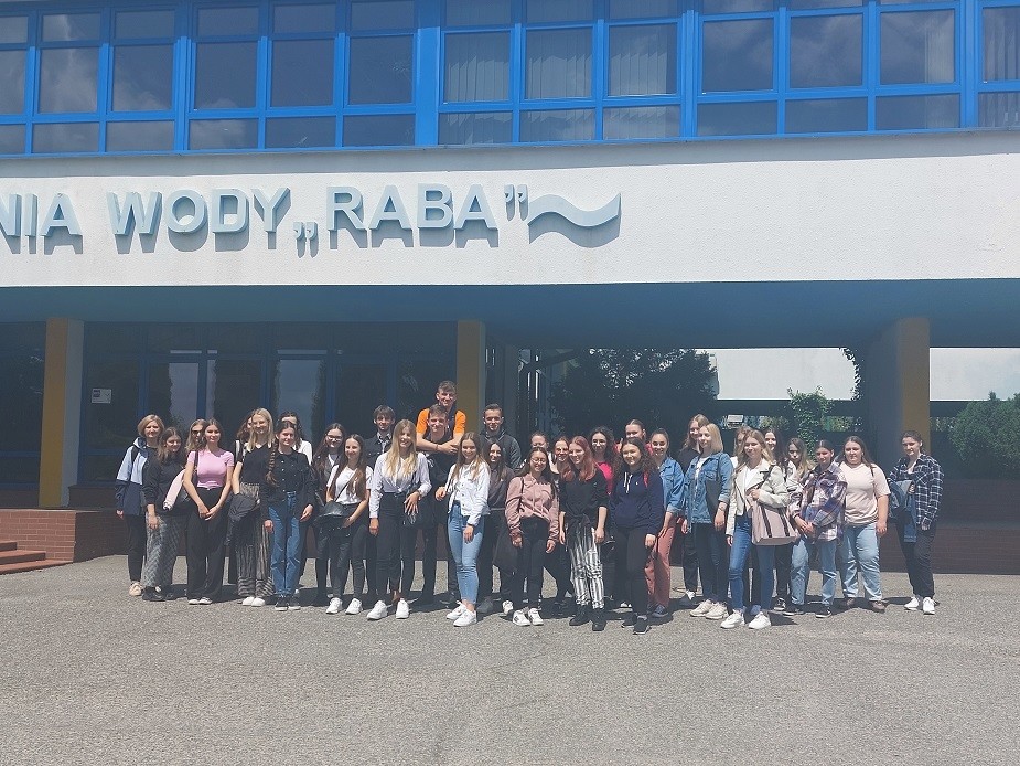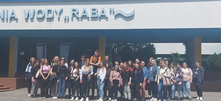 W dniu 15 czerwca 2023 r studenci II roku na kierunku biotechnologia odbyli zajęcia w Zakładzie Uzdatniania Wody "Raba" w Dobczycach. Zakład położony ok. 30 km od Krakowa, jest głównym dostawcą wody dla mieszkańców Krakowa. Są tam dwa ciągi technologiczne Raba I i Raba II. Średnia wielkość dostaw wody kształtuje się na poziomie 90 tys. m3, co stanowi około 50% łącznego zapotrzebowania krakowskiej aglomeracji. Podczas zajęć poruszono następujące zagadnienia: charakterystyka fizyczna, chemiczna i bakteriologiczna wód podziemnych i powierzchniowych uzdatnianych w ZUW "Raba". Procesy jednostkowe uzdatniania wody: fizyczne, chemiczne i biologiczne, mające na celu m.in.: klarowanie, filtrowanie, usuwanie związków żelaza i manganu, zmiękczanie, poprawianie smaku i odkażanie. Przedstawiono schemat technologiczny uzdatniania wody w ZUW "Raba" dla potrzeb wody przeznaczonej do spożycia: ozonowanie wstępne wody surowej, koagulacja poprzez dodanie środków chemicznych, sedymentacja dużych zanieczyszczeń na akcelatorach, filtracja na filtrach pośpiesznych otwartych piaskowo-antracytowych, dezynfekcja promieniami ultrafioletowymi i podchlorynem sodu. Omówiono problematykę wtórnego zanieczyszczenia wody.