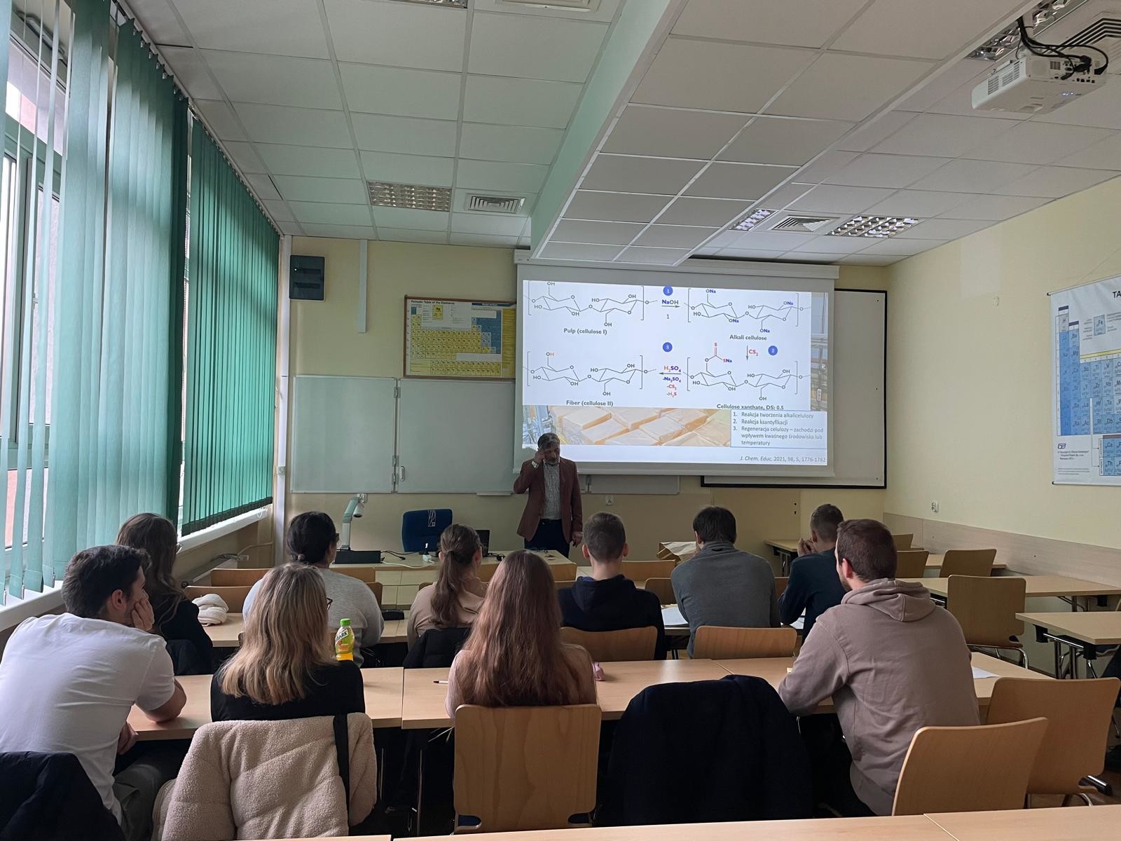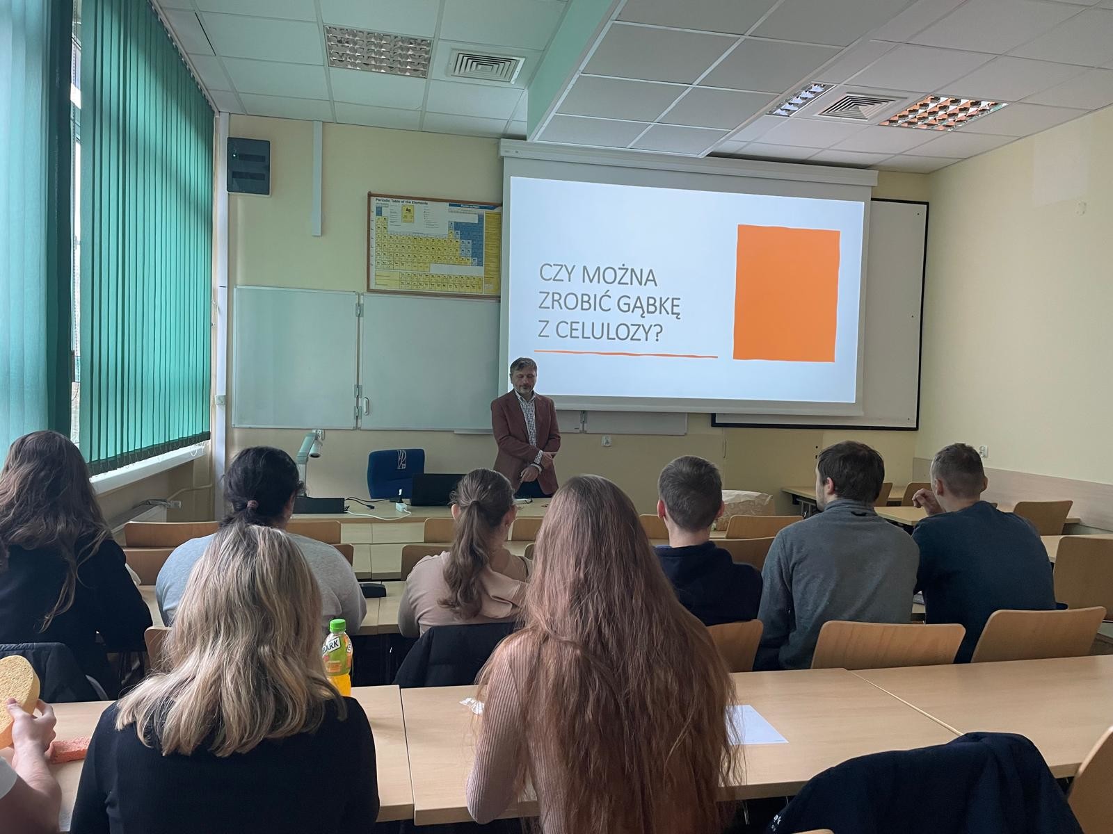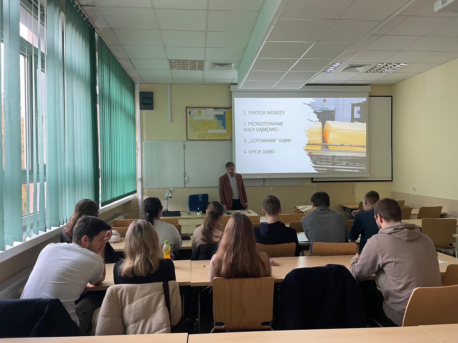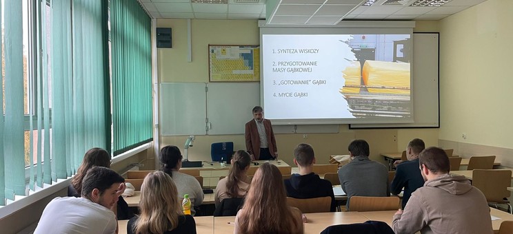 W ramach wykładu z przedmiotu „Technologia chemiczna – surowce”, realizowanego zgodnie z programem studiów dla studentów III roku studiów inżynierskich na kierunku technologia chemiczna, wykładowca, mgr inż. Krzysztof Trznadel, kierownik procesu pracujący w firmie SPONCEL, przedstawił zagadnienia związane z wykorzystaniem celulozy jako surowca odnawialnego do wytwarzania gąbek.