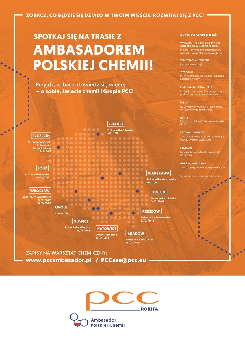 Serdecznie zapraszamy studentów Wydziału Chemicznego Politechniki Rzeszowskiej (szczególnie studiów magisterskich) do wzięcia udziału w spotkaniu z Ambasadorem Polskiej Chemii firmą PCC Rokita.