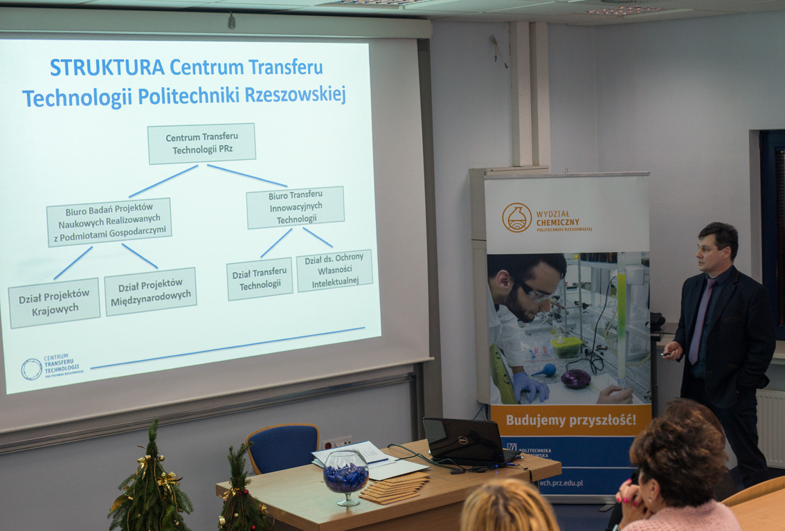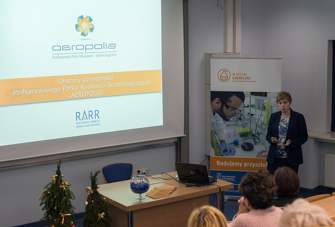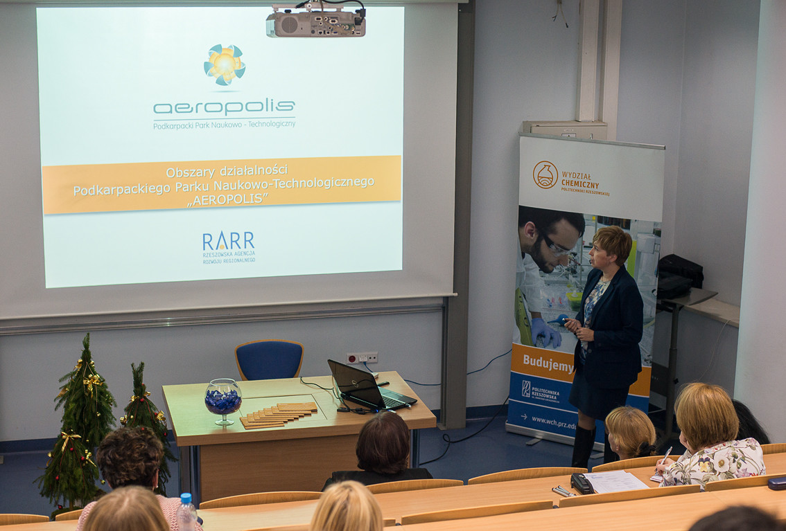Program tegorocznego spotkania obejmował m.in. wystąpienie Prorektora ds. rozwoju i kontaktów z gospodarką dr hab. inż. Mariusza Oleksego, prof. PRz, na temat możliwości pozyskiwania środków na projekty realizowane wraz z podmiotami gospodarczymi. Wspólne aplikowanie o środki ze źródeł zewnętrznych jest szansą na wykorzystywanie potencjału podkarpackich uczelni wyższych dla rozwoju innowacyjnych przedsiębiorstw. W nurt działań integrujących sektor naukowo - badawczym z przemysłem wpisuje się działalność Podkarpackiego Parku Naukowo-Technologicznego AEROPOLIS, którego zadania i możliwości przedstawiła Pani Dyrektor Barbara Kostyra.