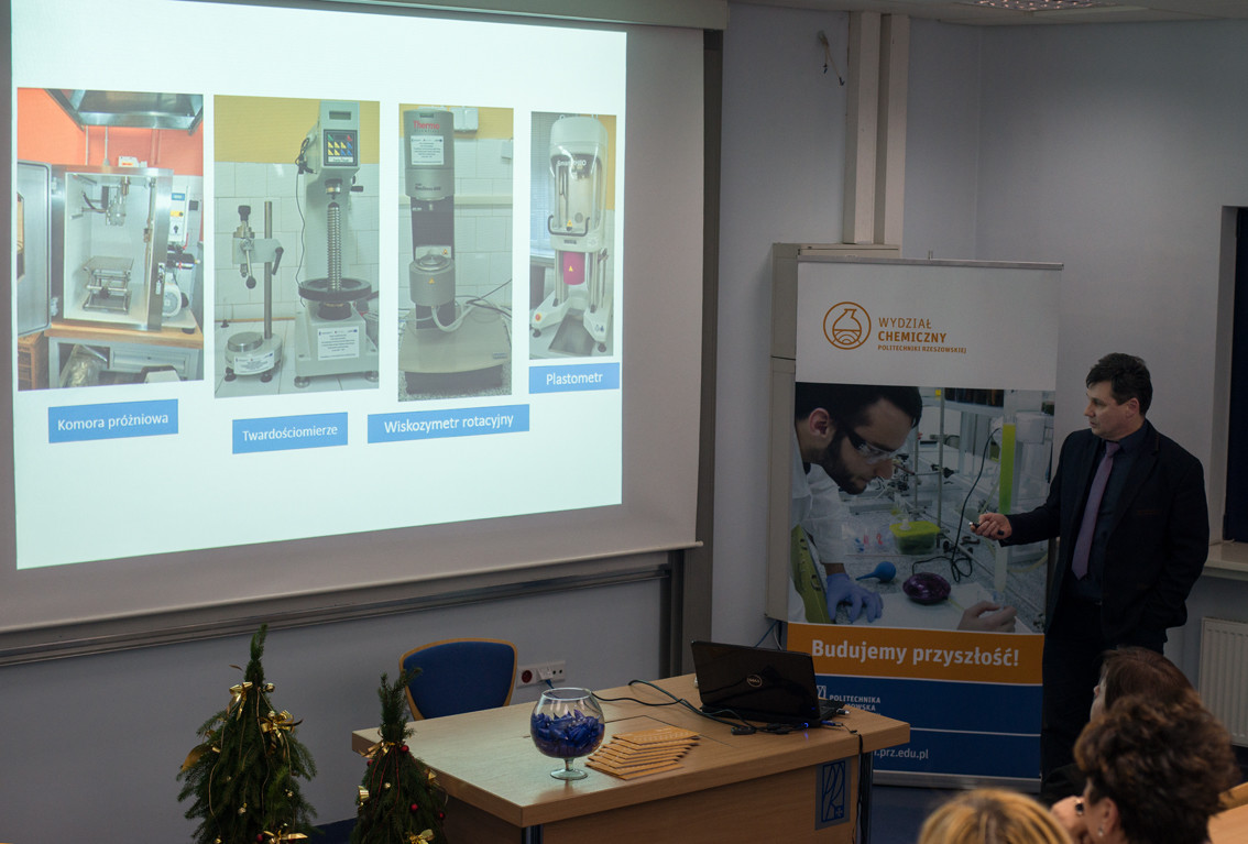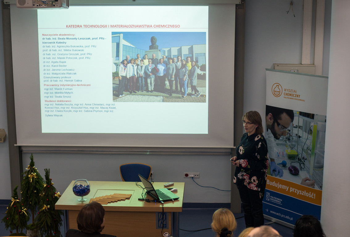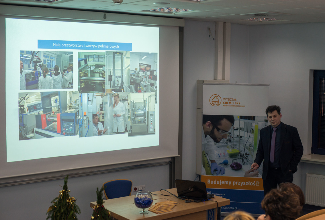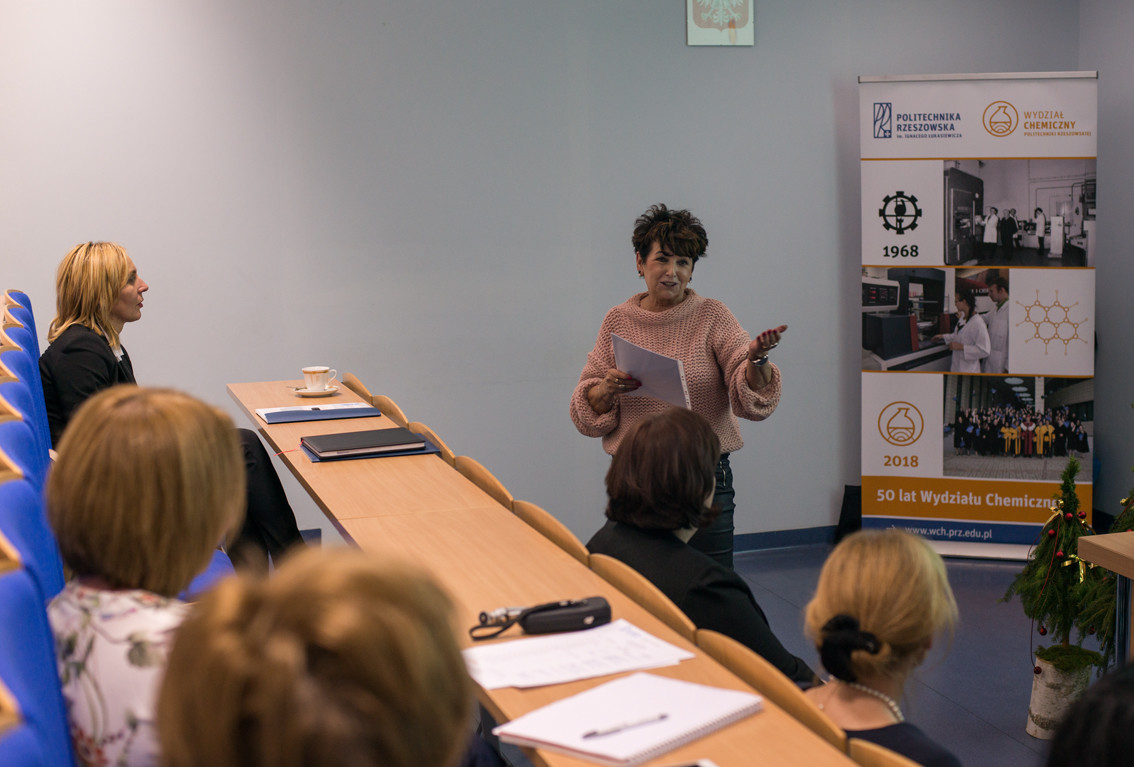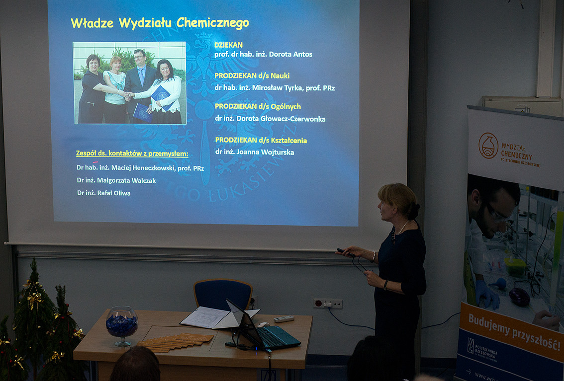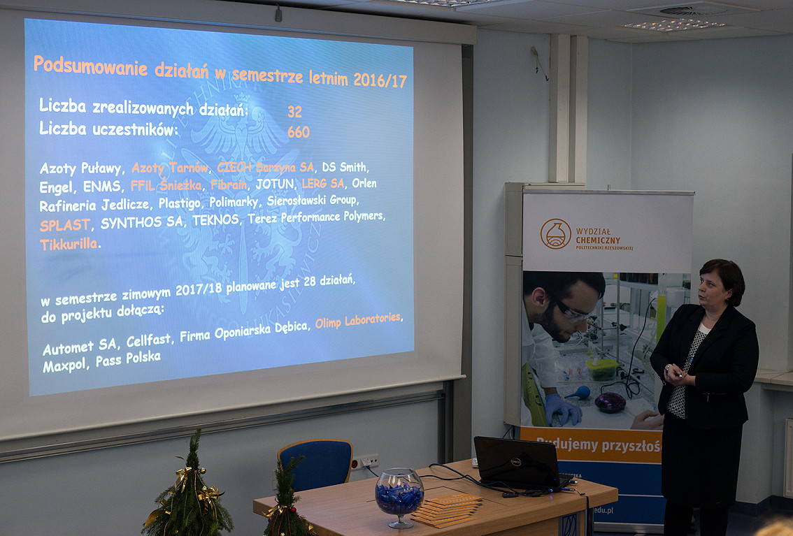 Jednym z tematów spotkania była współpraca Wydziału Chemicznego z otoczeniem społeczno-gospodarczym w ramach PO WER 2014-2020. Prodziekan ds. kształcenia Joanna Wojturska, przedstawiła postęp rzeczowy w realizacji projektu „Kuźnia kluczowych kompetencji studentów Wydziału Chemicznego Politechniki Rzeszowskiej”, który jest realizowany od 1.01.2017 r. W ramach projektu, w semestrze letnim 2016/17, podjęto współpracę z 19 pracodawcami mającymi siedziby na terenie całego kraju. W kolejnym semestrze planowana jest realizacja 28 działań a do projektu dołączą Automet SA, Cellfast, Firma Oponiarska Dębica, Olimp Laboratories, Maxpol, Pass Polska.
